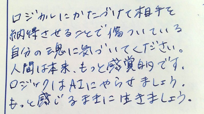105 もっと、感じるままに ノートからのメッセージ 2026.02.28 ロジカルに片づけて相手を納得させることで傷ついている自分の魂に気づいてください 人間は本来、もっと感覚的です ロジックはAIにやらせましょうもっと、感じるままに生きましょう